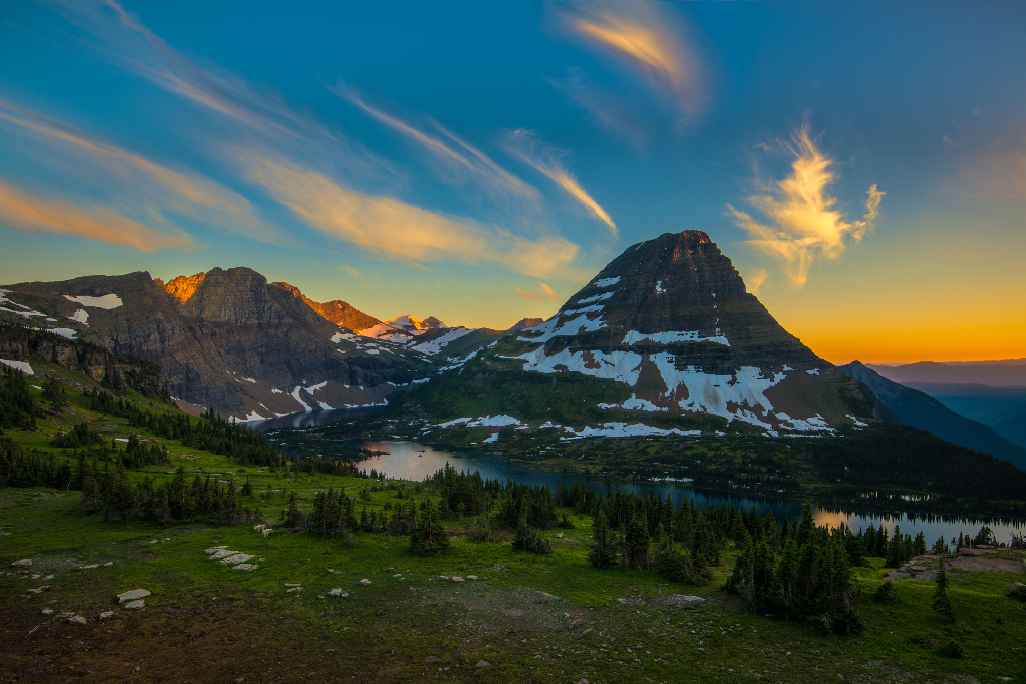 The highlights of my remaining days in Glacier included watching a pair of bull moose graze for a couple hours in Fishercap Lake one evening. a gorgeous sunrise with the colors in the sky going off in all directions, and hanging with some mountain goats. My last night I found myself howling in the darkness with a new friend as we were the last two people left on Logan Pass photographing the stars. There was some crazy airglow that was coming through in the images I was capturing of the Milky Way. I captured the images for another panorama and wouldn't you know it, again on my last shot of the series I caught a faint glow of the northern lights. This time I was positioned up on the boardwalk and not the parking lot so it was pitch dark. There was a photography club there when I got on the trail but they were all pointed at the Milky Way with their back to the north. There wasn't really anything in the forecast so this was a bit of a surprise to me. After I pointed my camera in the right direction and photographed the unexpected aurora, I yelled out into the dark to see if anyone else was seeing what I saw. But they had all gone except for the one guy who was just happy and howling. While the aurora wasn't as intense as the other night, it was still there and beautiful, and I was virtually alone taking it all in with a sky full of stars.